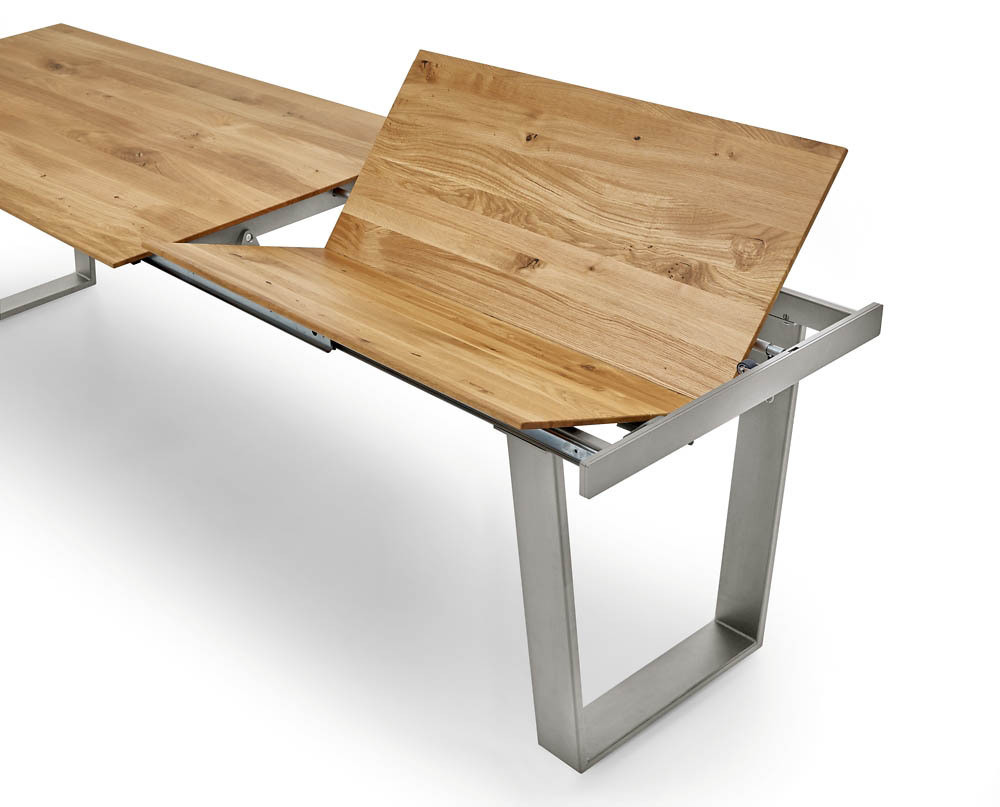 Tischplatte Charakter-Eiche massiv, geölt, eine innenliegende Falteinlage 100 cm, Plattenprofil FACETTE, Gestell Trapezkufe Edelstahl gebürstet, Kufengestell mit integrierten Rollen, LBH ca. 180(280)/95/76 cm