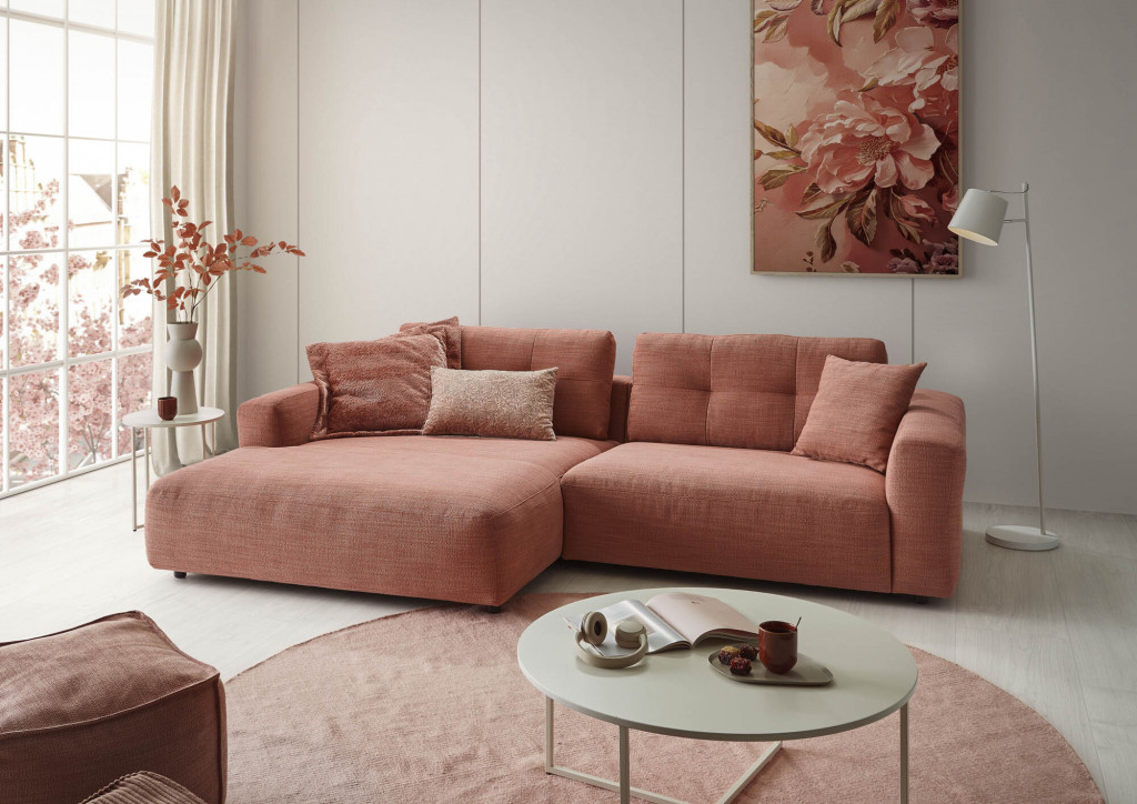 100% Polyester, Farbe peach, Rücken echt, Rückenkissen Variante auf Lücke, Sitz Kaltschaum, Fuß Gleiter, Sitzhöhe 42 cm, Sitztiefe 81 cm, bestehend aus:
