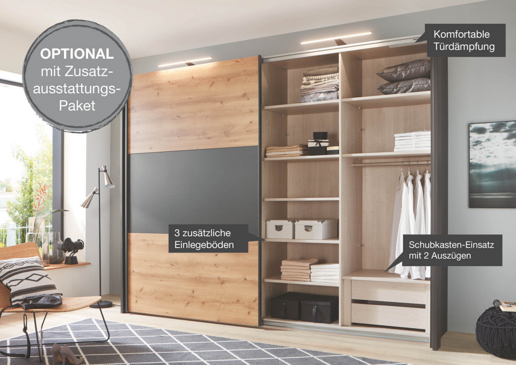 Front Bianco-Eiche-Nachbildung, mittlere Felder in grpahit-Dekor, Korpus graphit Dekor, Griffleisten graphit-Dekor, ohne Kranzleiste, 2-türig, BHT ca. 300/217/67 cm