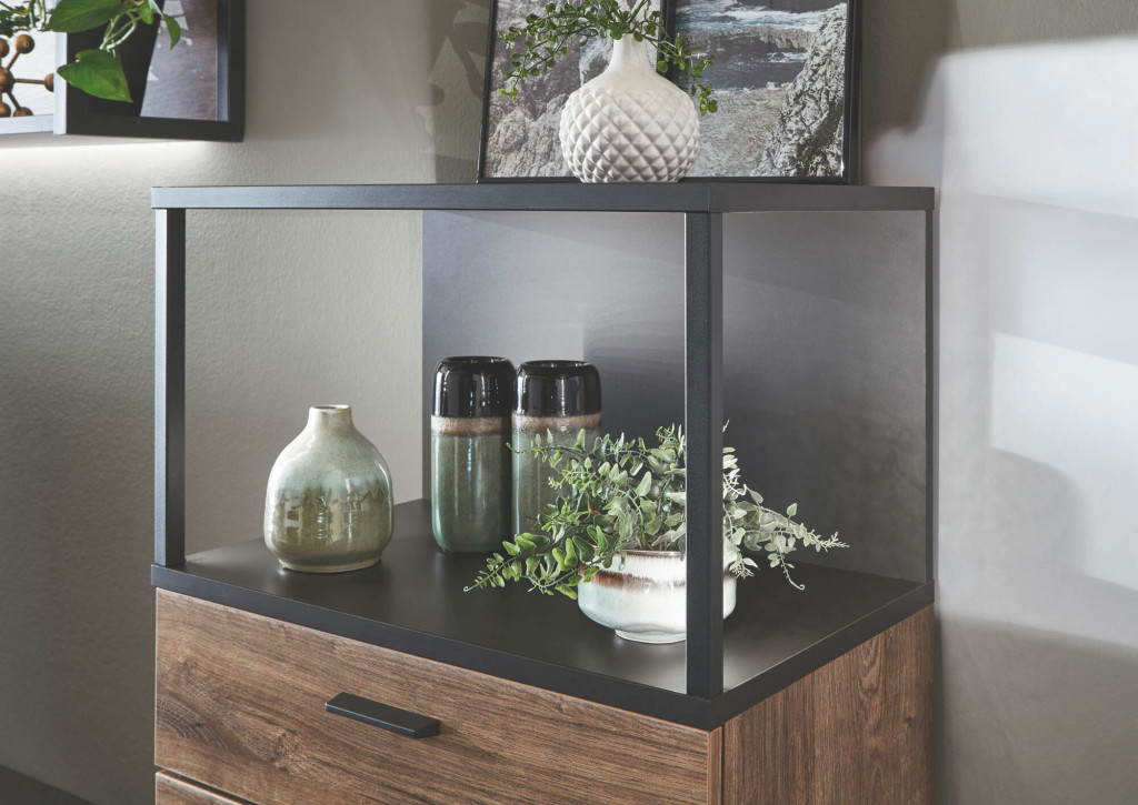 Front Eiche Ribbeck Cognac / Cosmos Grey Melamin, Korpus Eiche Ribbeck Cognac / Cosmos Grey Melamin, Alurahmen schwarzgrau mit Struktur bei den Vitrinen, Glas Klarglas, Schubkästen mit Selbsteinzug und Dämpfung, Kombi bestehend aus: