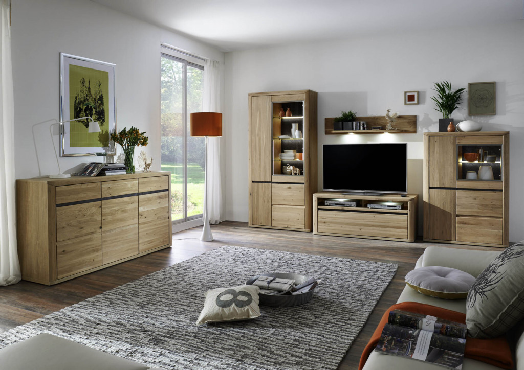 Front Alteiche Stab massiv geölt, Korpus Alteiche foliert, sichtbare Rückwände und Griffleisten Schiefer-Optik, Kombi bestehend aus: