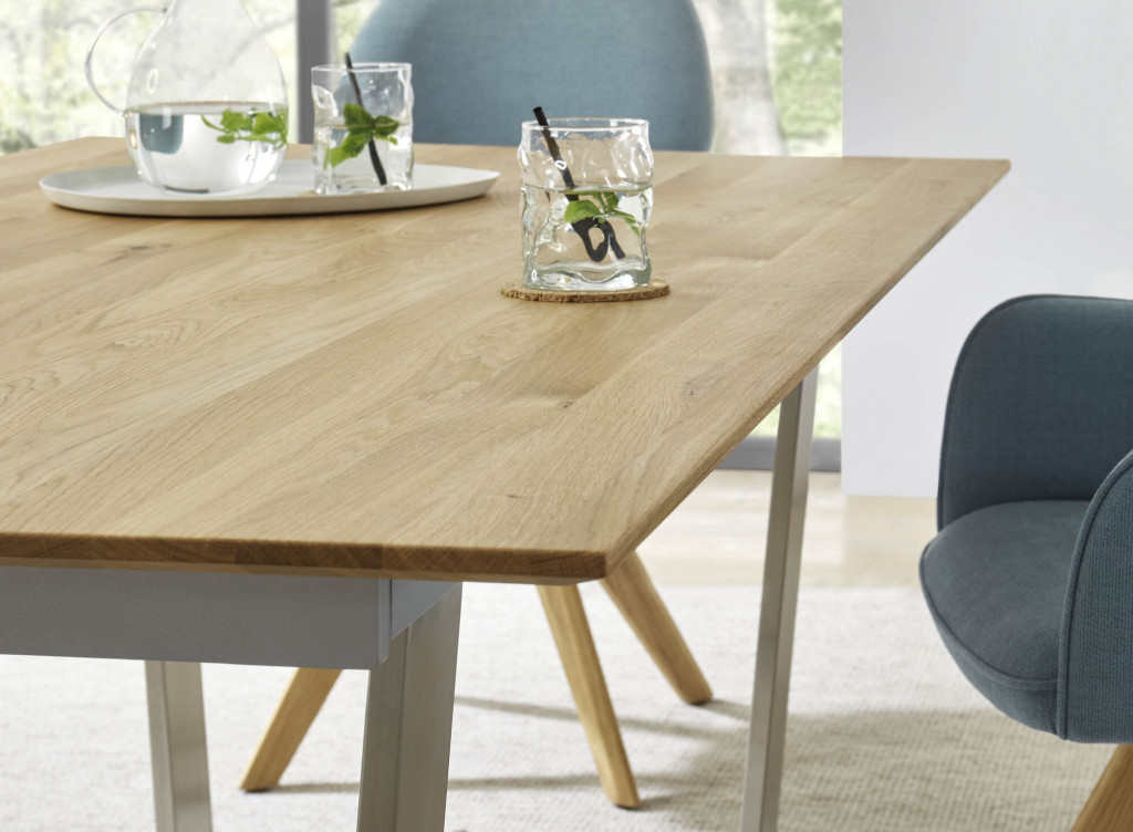 Tischplatte Charakter-Eiche massiv, geölt, eine innenliegende Falteinlage 100 cm, Plattenprofil FACETTE, Gestell Trapezkufe Edelstahl gebürstet, Kufengestell mit integrierten Rollen, LBH ca. 180(280)/95/76 cm